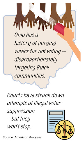 Ohio has a history of purging voters for not voting — disproportionately targeting Black communities. Courts have struck down attempts as illegal voter suppression – but they won’t stop.
