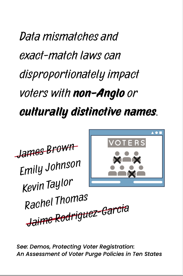 Data mismatches and exact-match laws can disproportionately impact voters with non-Anglo or culturally distinctive names.