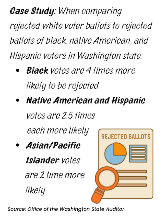 Case Study: When comparing rejected white voter ballots to rejected ballots of black, native American, and Hispanic voters in Washington state:
