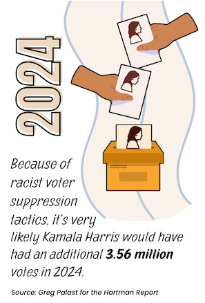Because of racist voter suppression tactics, it’s very likely Kamala Harris would have had an additional 3.56 million votes in 2024.